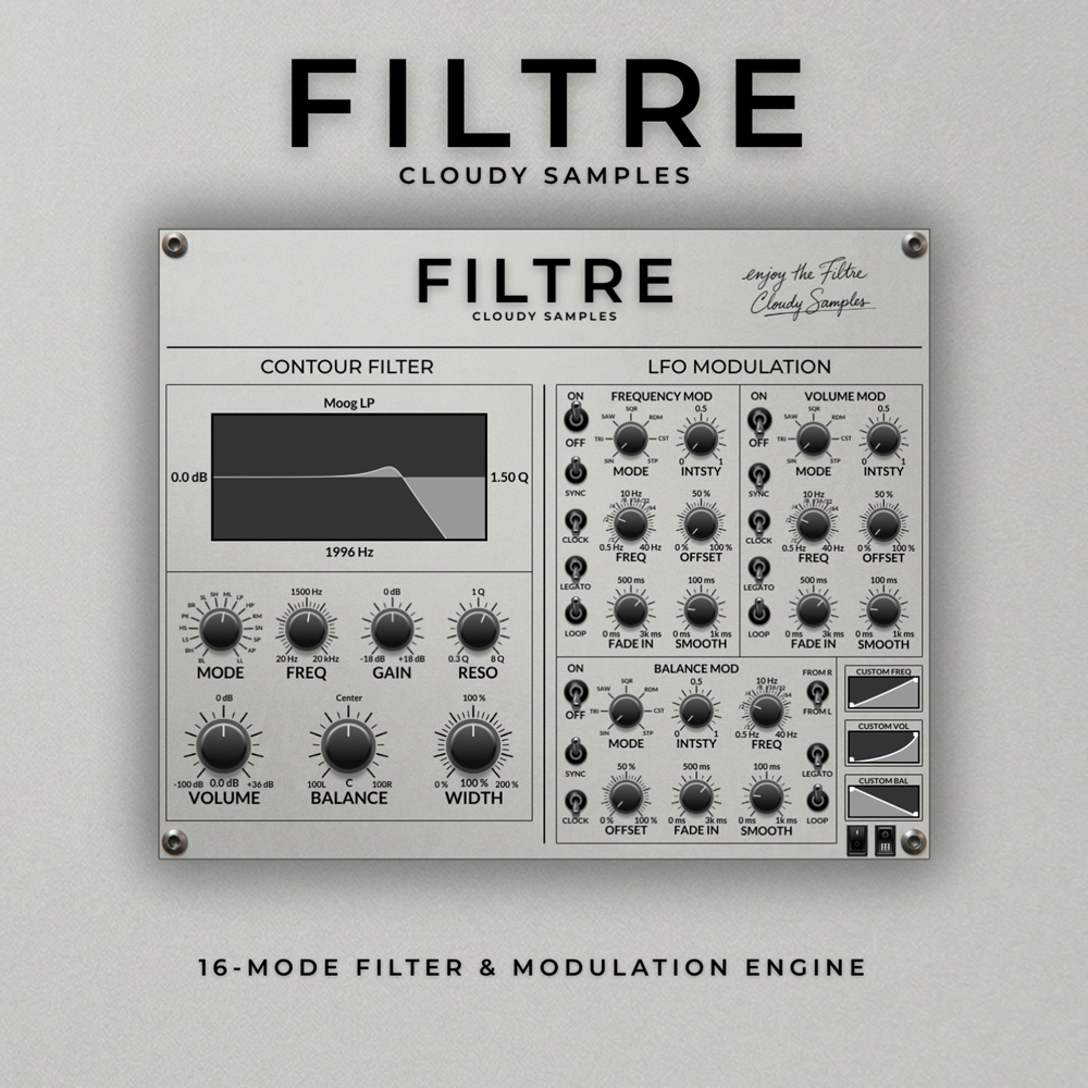 Cloudy Samples has released Filtre, a free modulation filter plugin that pairs a 16-mode Contour Filter with a triple-LFO engine. It turns static sounds into moving, animated textures – from analog-style sweeps to rhythmic gating and panning – and is available at no cost as a VST3/AU effect for Windows and macOS.